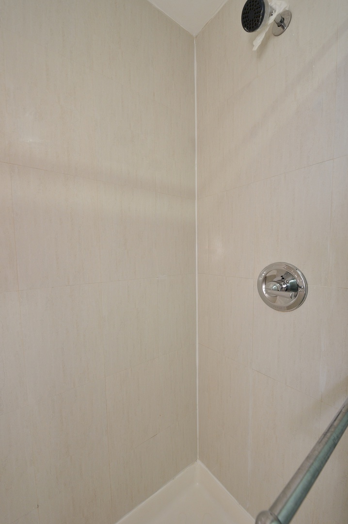 Step into your private shower with modern rainfall showerhead and sleek chrome fixtures for a refreshing start to your day.
