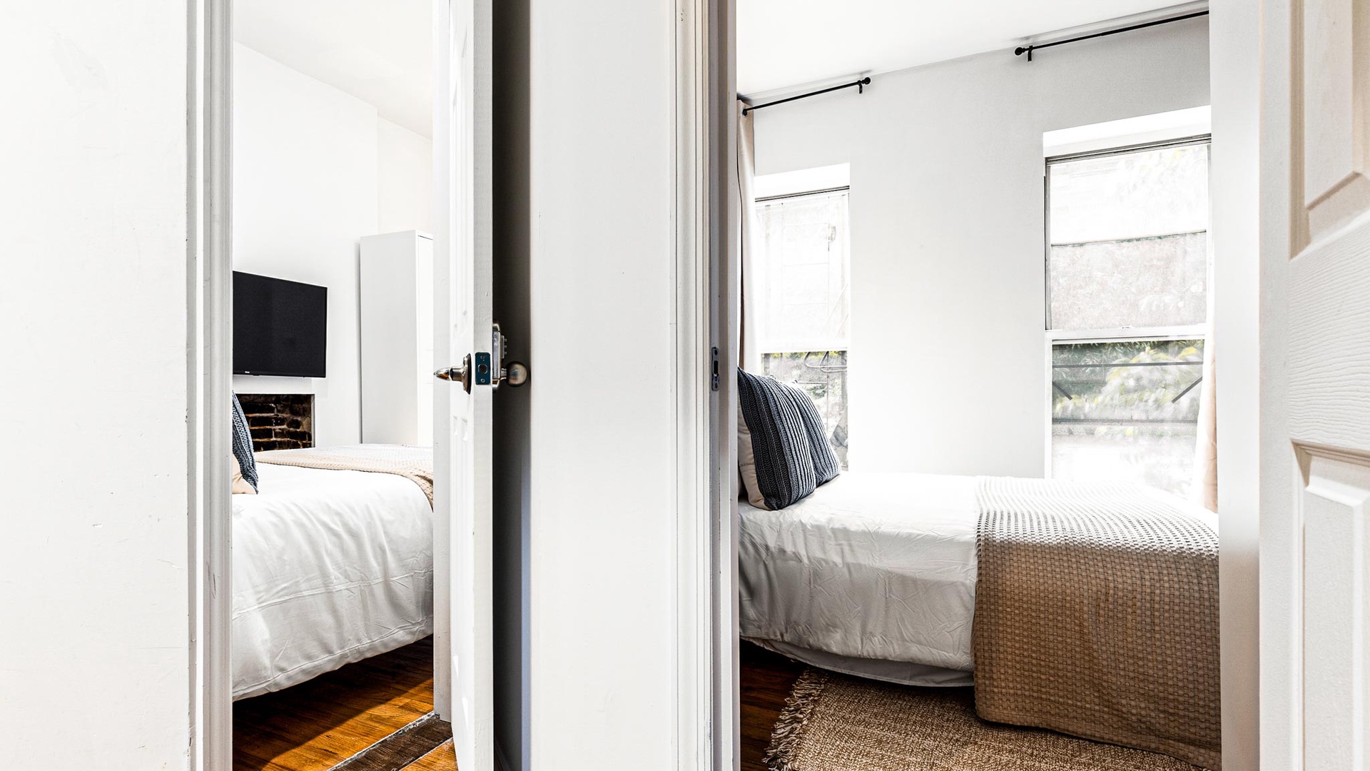 Wake up to natural light streaming through large windows, creating a peaceful retreat with comfortable bedding and warm hardwood floors.