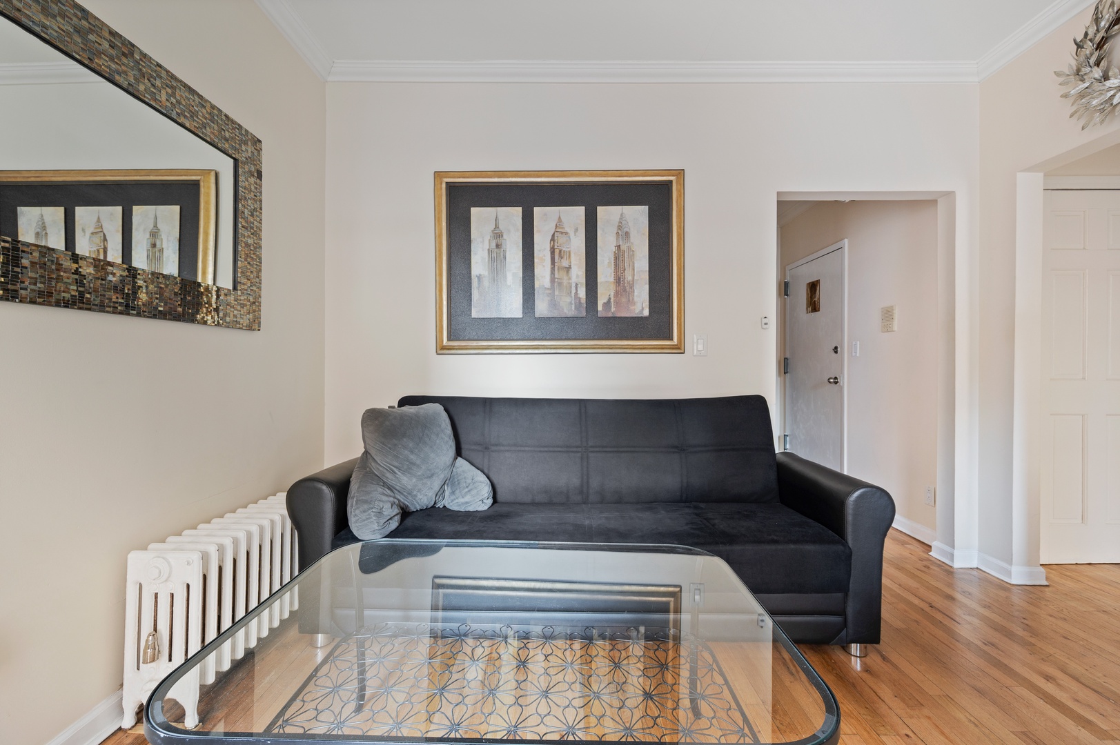 Step into your bright, open living space where warm hardwood floors and thoughtful touches create the perfect home base for your city adventure.