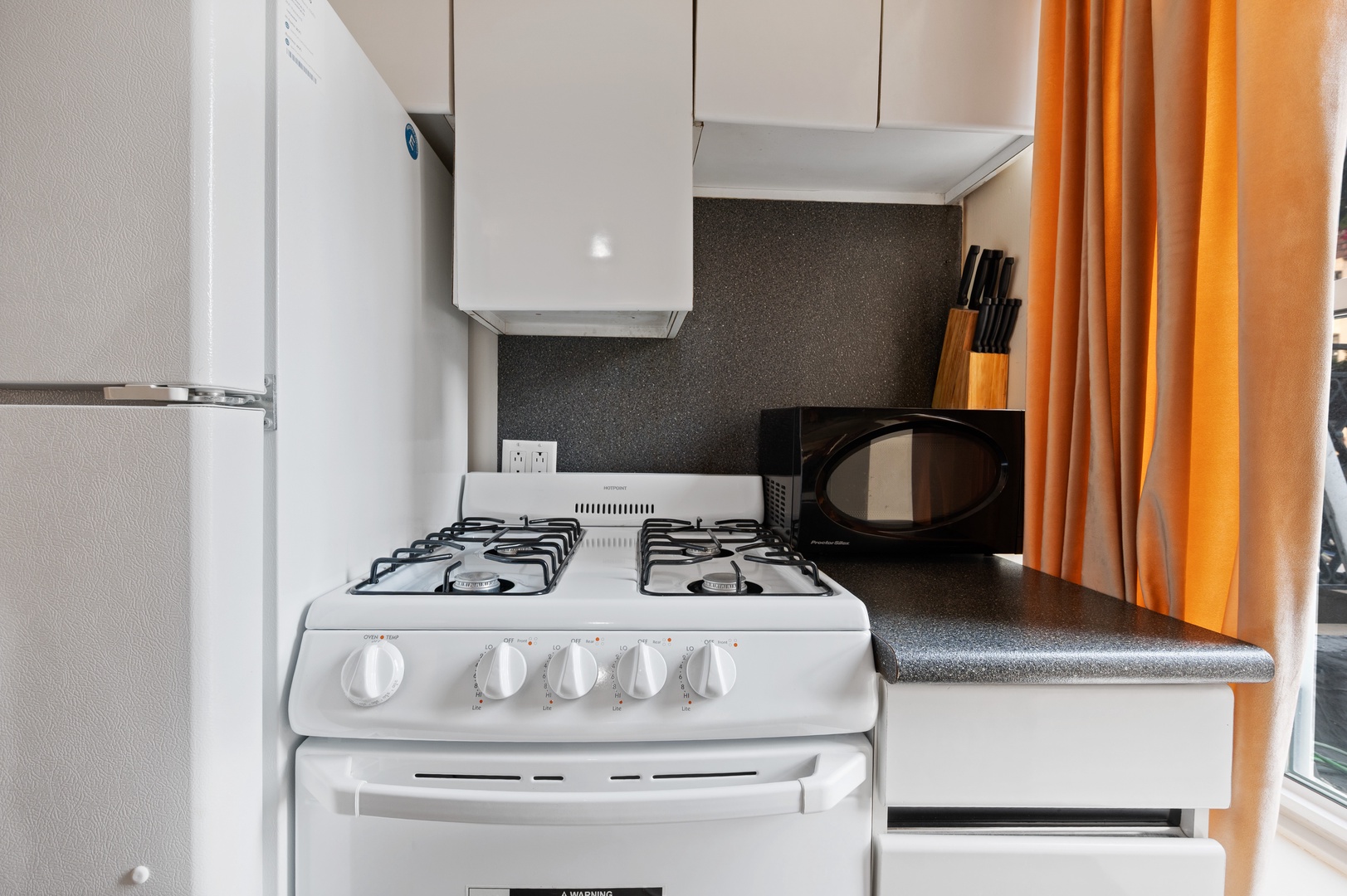 Your compact kitchen features everything you need: gas stove, microwave, and knife set for preparing delicious meals during your stay.