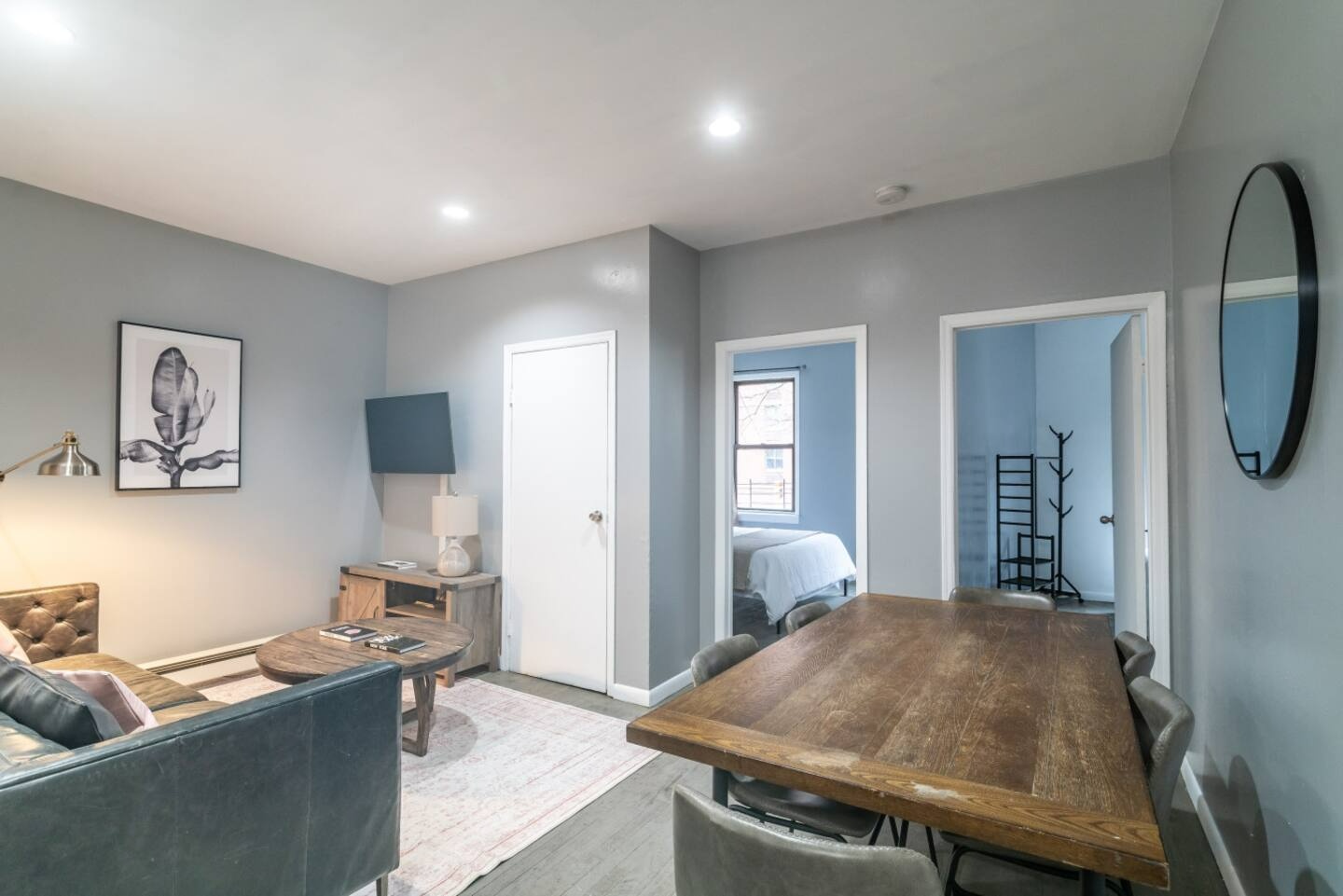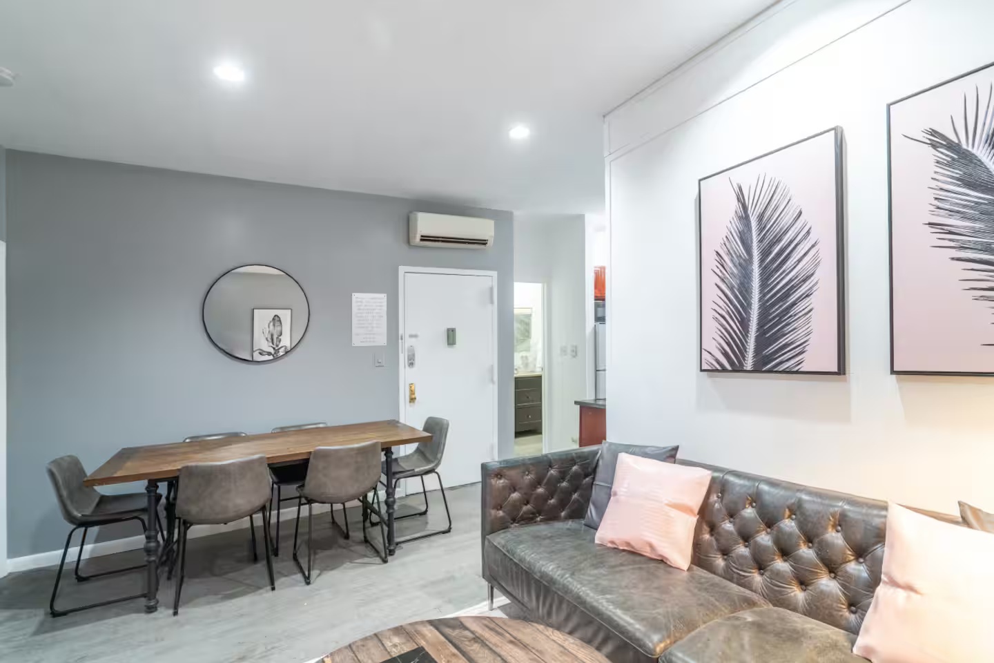 Relax in your stylishly furnished living space featuring a plush sofa, elegant dining table, and modern kitchen - perfect for unwinding after exploring.