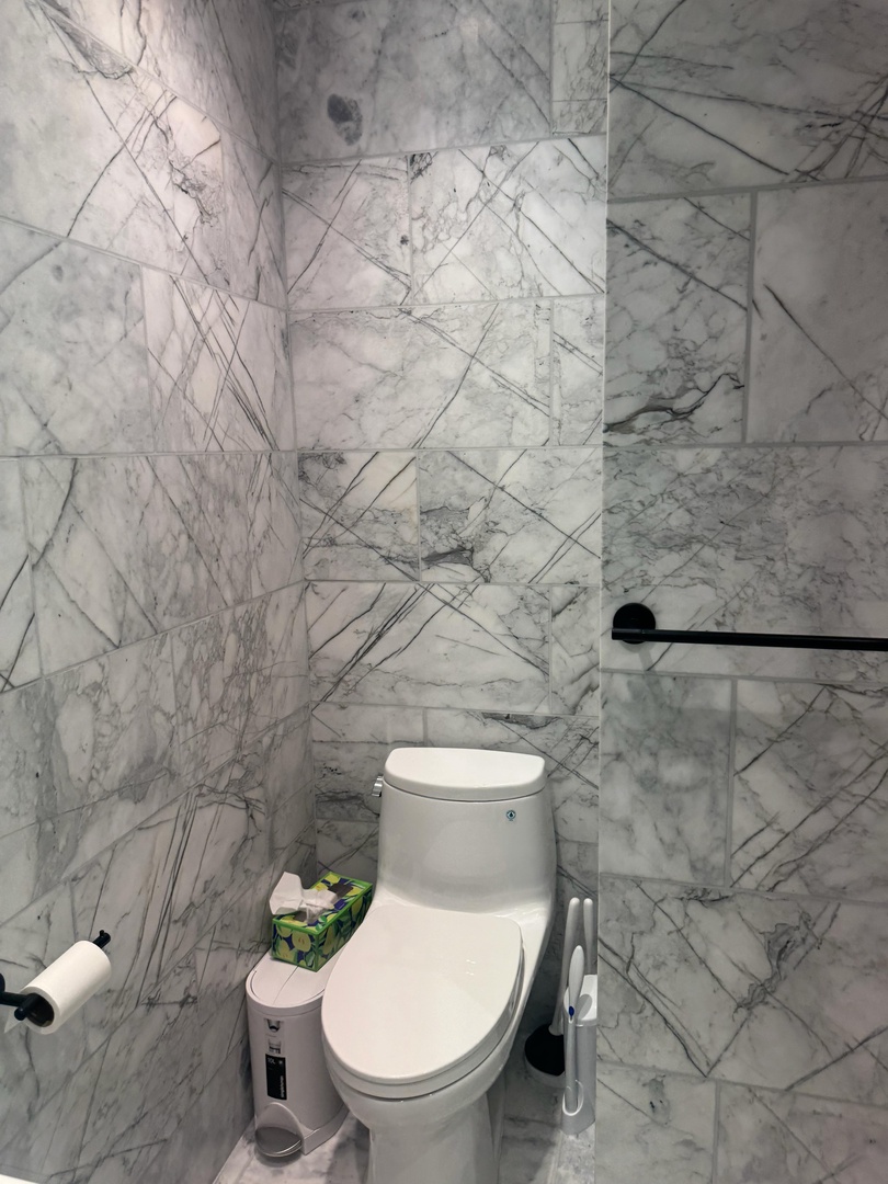 Your modern kitchen features sleek white cabinetry, marble backsplash, and premium stainless steel appliances for effortless meal preparation during your stay.
