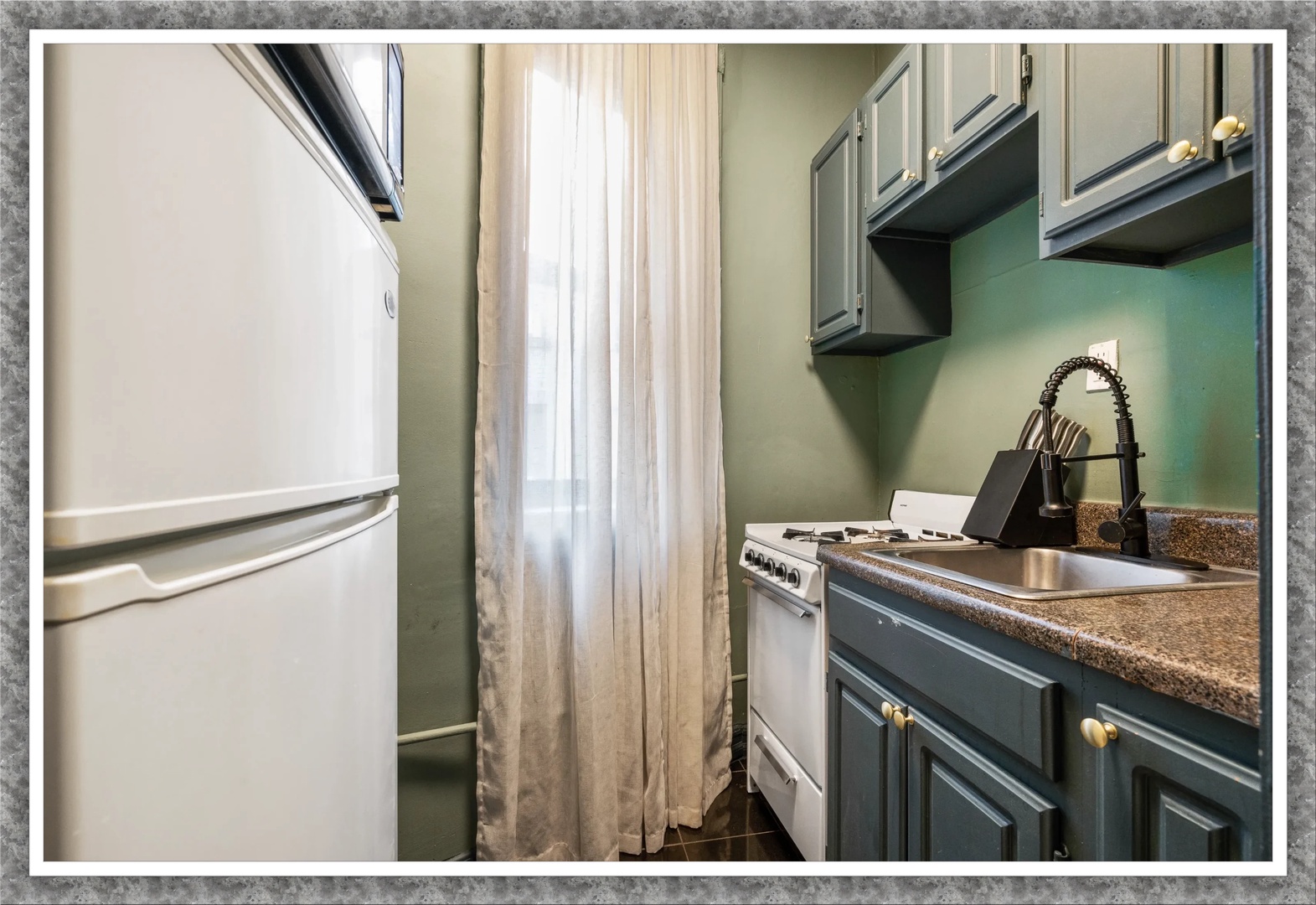 The bright bedroom offers a comfortable queen bed, while the living area features a pull-out sofa bed to accommodate additional guests. Relax in the stylish living room with a flat-screen TV, high-speed WiFi, and classic touches that blend modern convenience with vintage charm. The fully equipped kitchen is perfect for preparing meals, whether you're enjoying coffee before heading out or a quiet dinner in.
