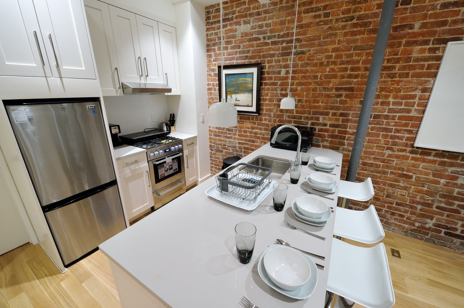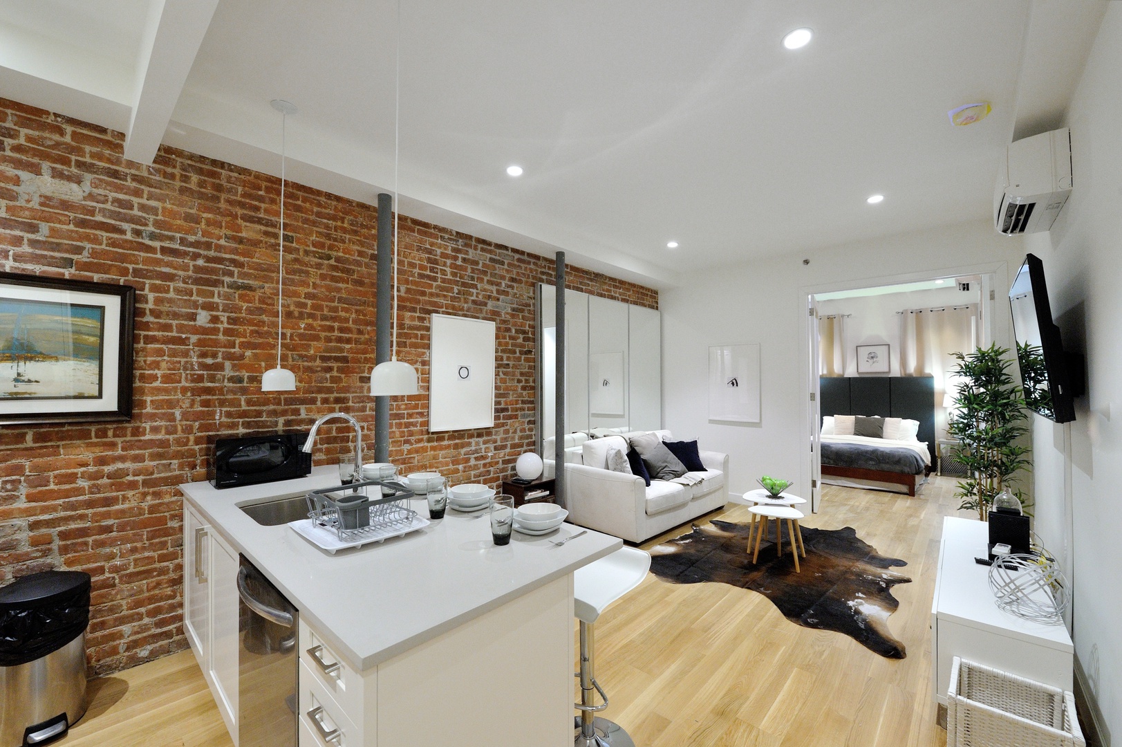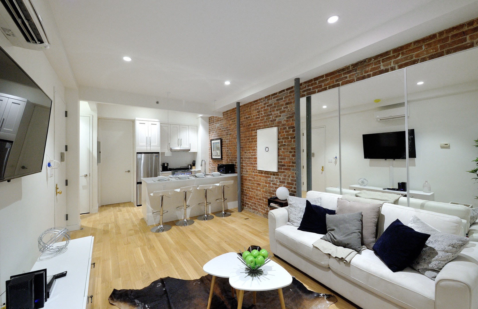 Step inside and be greeted by a bright, airy space featuring high ceilings, exposed brick walls, and gleaming wood floors that add a touch of warmth to the contemporary décor. The living area is outfitted with sleek, modern furniture, creating a stylish yet comfortable setting for relaxation or socializing. Whether you’re unwinding after a day of sightseeing or hosting friends for a night in, this space has everything you need, including WiFi, a flat-screen TV, and air conditioning.