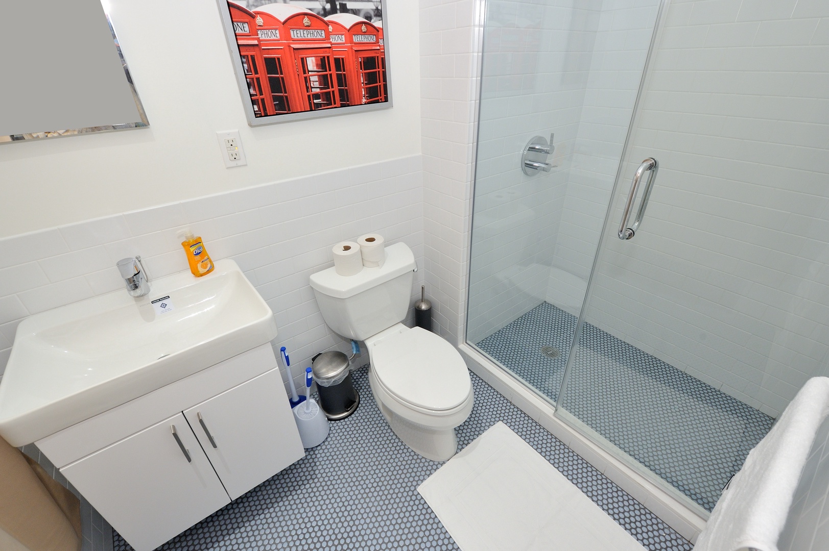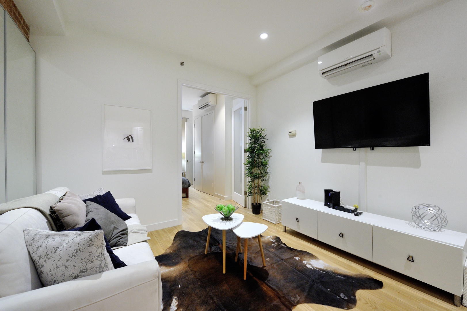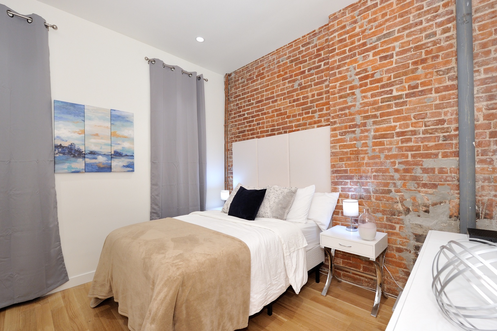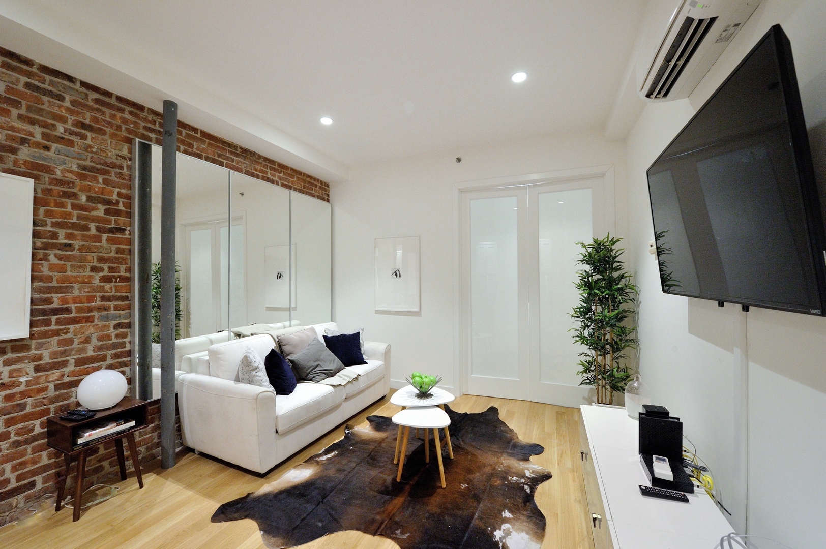 Step inside and be greeted by a bright, airy space featuring high ceilings, exposed brick walls, and gleaming wood floors that add a touch of warmth to the contemporary décor. The living area is outfitted with sleek, modern furniture, creating a stylish yet comfortable setting for relaxation or socializing. Whether you’re unwinding after a day of sightseeing or hosting friends for a night in, this space has everything you need, including WiFi, a flat-screen TV, and air conditioning.